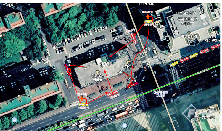 왜일까? 자세히 보면 차량 배치에서 일정한 의도가 보이기 시작한다. 당신이 소방관이라면 단번에 알아차렸을 거다. 맞다. 바로 차량의 ‘회차 가능성’이다.