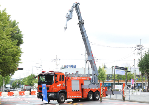 무인파괴방수차는 샌드위치 패널 등 조립식 건축물이 다수 배치된 국가산업단지에서 공장 내부 화재 발생 시 소방관의 진입 없이 외벽을 파괴하고 방수 노즐을 공장 내부로 진입시켜 직접 화재를 진압하는 장비다.