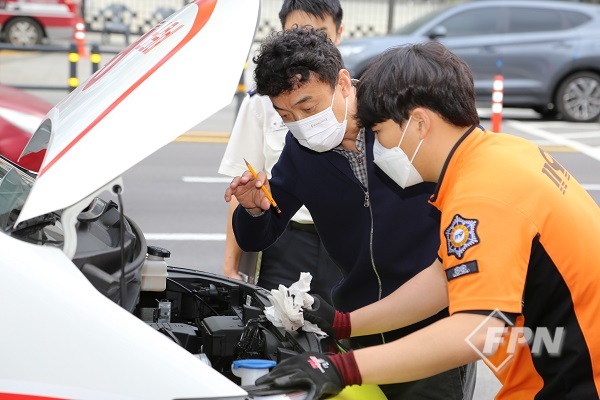 ▲ 서울소방 장비점검관과 함께 구급차량 엔진룸 관리실태를 살펴보고 있다.