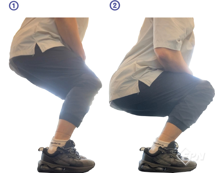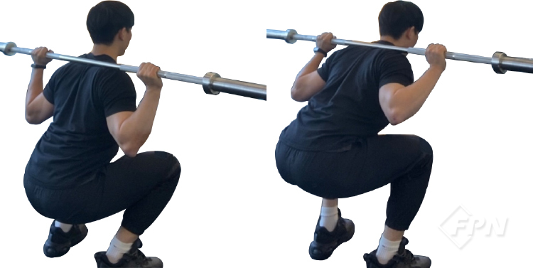 똑같은 스쿼트 자세지만 마지막 ③번 사진을 비교해 보면 오른쪽 사진의 상체가 앞으로 많이 쏠려 있는 걸 볼 수 있습니다. 이처럼 상체가 앞으로 많이 쏟아지는 자세에서의 스쿼트는 다리보단 허리에 자극을 많이 줄 수 있습니다.