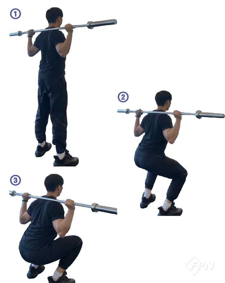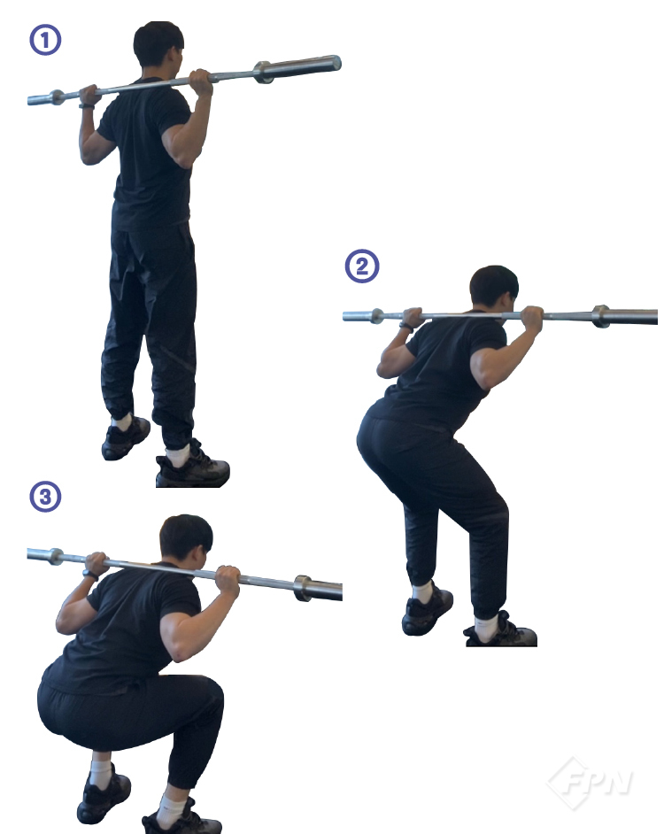 순서는 ①-②-③-②-①입니다. 이때 가장 중요한 점은 허리의 움직임이 앞으로 굽혀지지 않아야 한다는 겁니다. 또 둔부는 뒤에 의자가 있다고 가정하고 앉듯이 해야 합니다. 상체가 앞으로 쏟아지지 않고 엉덩이가 앉으면 다리에 충분한 자극이 전달되므로 이게 바로 올바른 스쿼트 자세입니다.