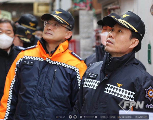 ▲ 황기석 서울소방재난본부장이 종로구 돈의동 쪽방촌을 순시하며 이정희 종로소방서장과 함께 건물 외부를 살펴보고 있다.