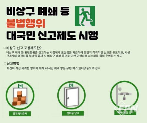 신고 대상은 문화ㆍ집회시설, 판매시설, 복합건축물, 운수시설, 노유자 시설, 의료시설, 위락시설, 숙박시설 등이다. 위반사항은 ▲비상구 폐쇄(잠금 포함) ▲피난ㆍ방화시설(복도ㆍ계단ㆍ출입구) 훼손 ▲피난ㆍ방화시설 주변 물건 적치 또는 장애물 설치 등이 해당한다.