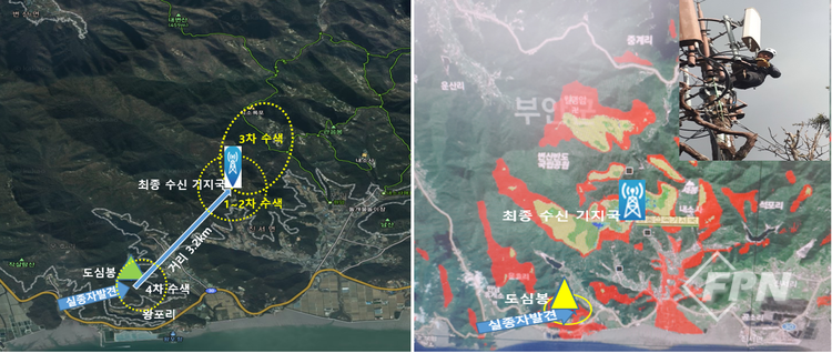 이에 논산 양촌리에 수신된 기지국 커버리지를 분석했을 때 천등산에 얕게 흩뿌려진 커버리지와 수색 중 추가로 수신된 기지국 정보ㆍ커버리지를 구글 지도에서 보니 해발 400m 정도에 설치된 기지국이 천등산 방향 좌우 해발고도가 450m 이내의 범위였다.
