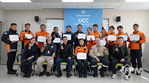 ![]() ▲ 지난 2022년 10월 UN UCC 과정에 참여한 국내외 구조대원들이 기념촬영을 하고 있다. © 소방청 제공 |