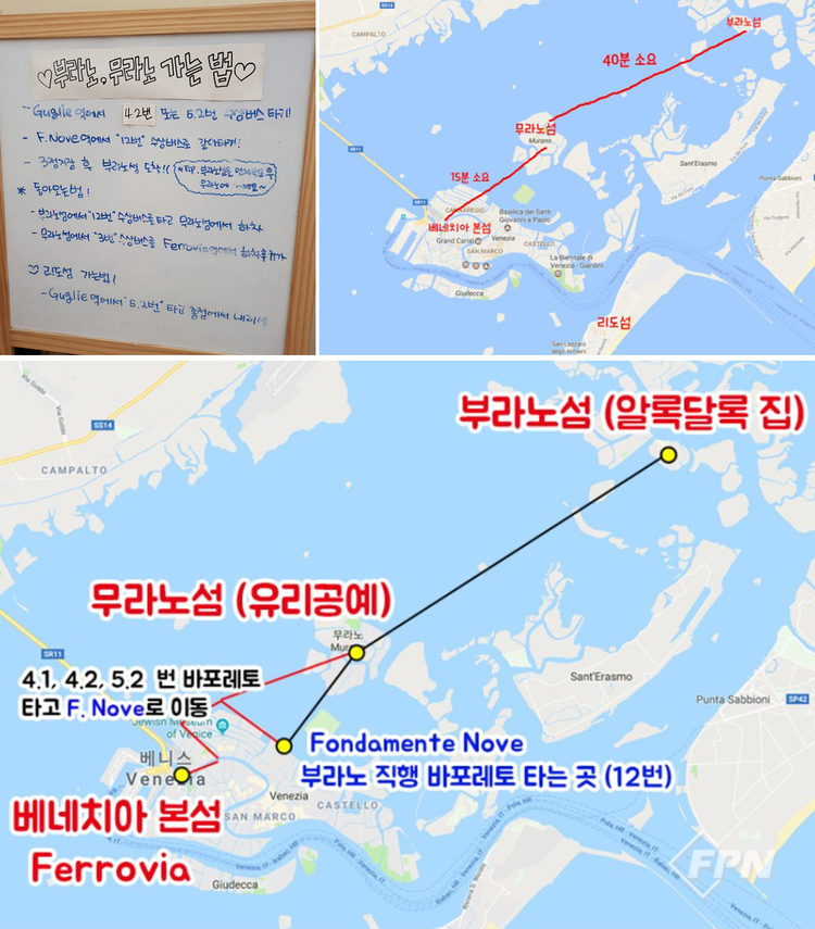부라노ㆍ무라노섬 가는 법 산타루치아역 앞 ferrovia 정류장에서 바포레토 3번 탑승 또는 산 마르코 광장 S.Zaccaria 정류장에서 4.1번 또는 4.2번 탑승