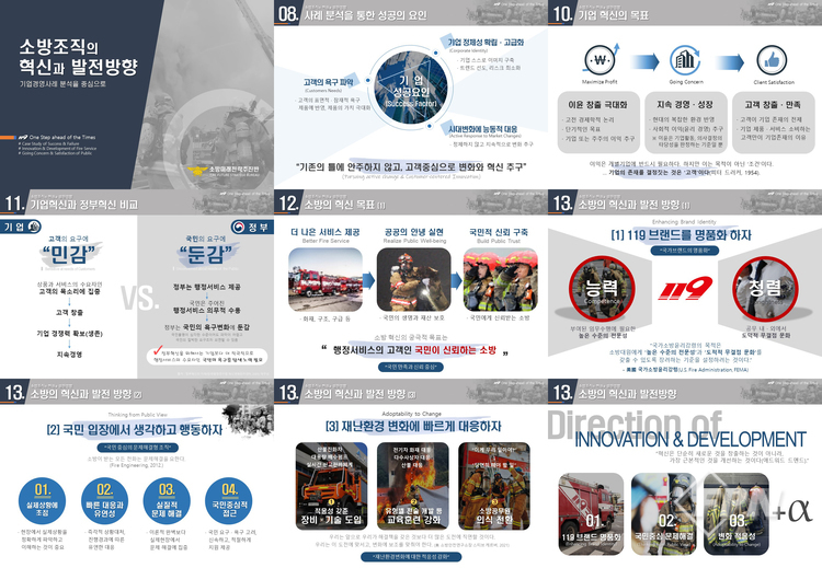 공공성을 띤 소방조직을 민간기업의 경영사례와 비교해 혁신과 발전 방향을 모색해봤다. 성공한 기업의 특징은 고객의 욕구를 파악하고 기업 정체성 확립과 고급화, 시대변화에 능동적으로 대응하는 등 기존의 틀에 안주하지 않고 변화와 혁신을 추구하고 있었다.