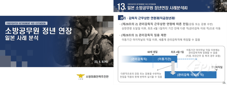 따라서 우리도 소방공무원의 정년연장이 가시화될 경우 이 같은 사례를 바탕으로 조직 내ㆍ외의 합의와 제도적 보완장치를 마련하는 게 필요할 거로 보인다.