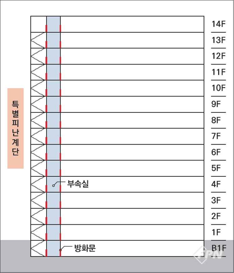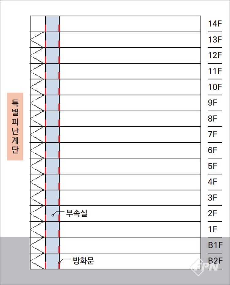 특별피난계단의 설치구조에서 중요한 게 ‘배연설비가 있는 부속실’ 설치다. 이 부속실은 피난계획에서 외부로 나가기 위한 1차 안전구역의 역할을 한다.