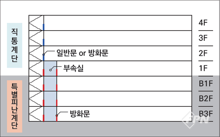 그러나 이 규정의 취지는 지상층의 건축물은 층수와 높이로 본다면 피난 소요시간이 더 요구돼 계단실로 이동하는 경로상에 안전 경유 거실(부속실)을 설치하면서 안전지대를 확보한 것으로 볼 수 있다.