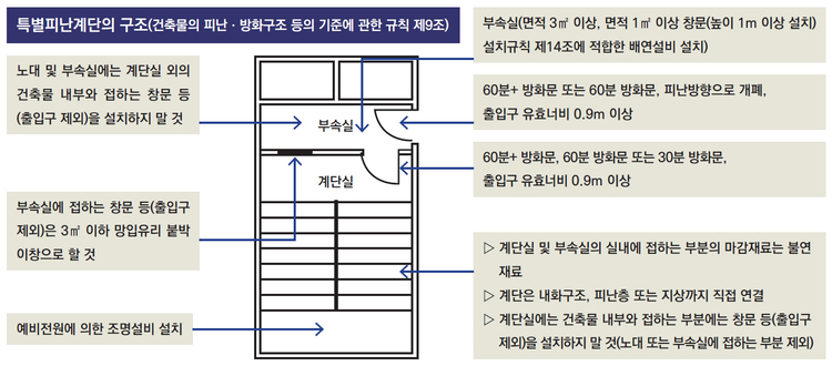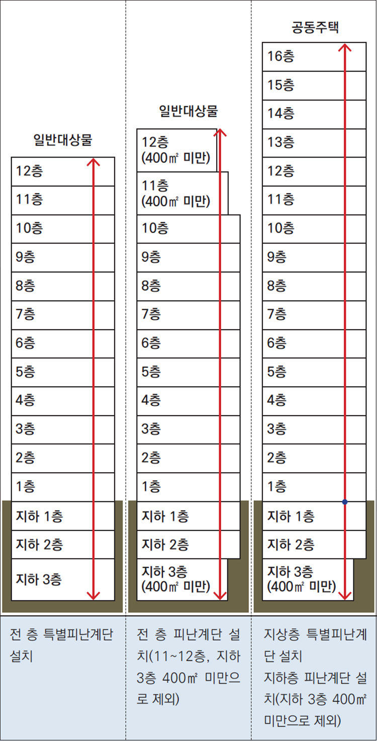 지상층은 피난계단 구조, 지하층은 특별피난계단의 구조로 설치