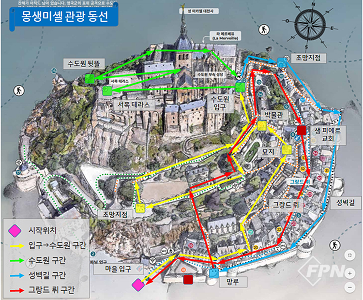 몽생미셸의 매력은 바다 위 신비롭게 솟아있는 드높은 섬이라는 점이다. 수도원과 성당, 작은 정원, 군사 요새, 감옥, 왕족의 귀빈실, 명상실, 선물 가게, 호텔, 레스토랑뿐 아니라 수도원의 거대한 벽 아래 형성된 작은 주택은 지금도 유지되고 있다. 1층은 서민, 2층은 왕과 귀족, 3층은 성직자가 머물렀다고 한다.