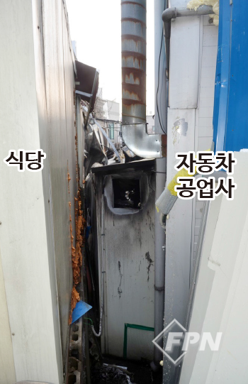 어느 해 12월 오후 10시 30분께 식당과 자동차 공업사 사이에서 화재가 발생했다. 건물과 건물의 경계는 대지경계선으로 분리되고 담장이나 별도로 구별할 수 있는 구조물 없이 건물이 축조돼 있었다. 양쪽 모두 발화지점 인근은 샌드위치 패널로 축조됐고 연소로 인해 샌드위치 패널이 도괴된 상태였다.