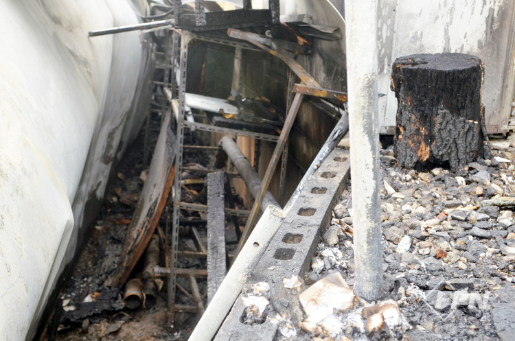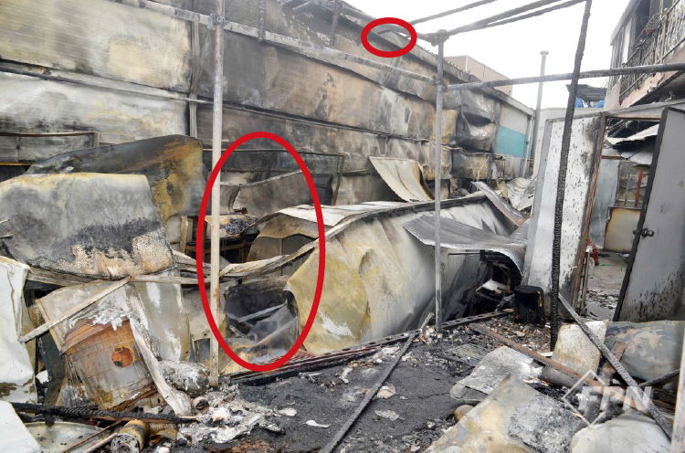 식당 창고 하단이며 자동차 공업사와 마주 보는 부분이다. 하단의 플라스틱 적재물이 원형으로 잔류했다. 이러한 형태는 내부 발열이 아니라 외부에서 화염전파로 소훼했다고 판단했다.