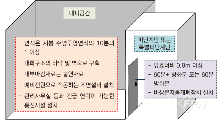대피공간에는 소방시설을 설치해야 할 규정이 없다. 따라서 안전한 피난 공간 확보를 위해선 피난안전구역의 설치 기준처럼 가압식 제연설비 등 소방시설 설치에 대한 기준을 마련해야 한다.
