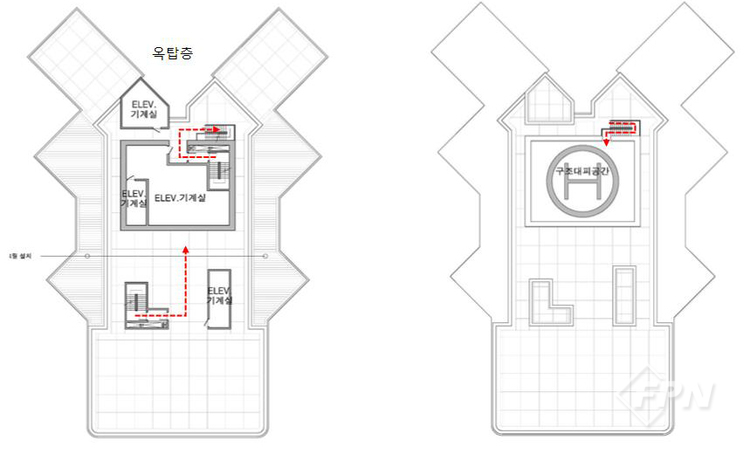 그러나 건축사 대부분은 특별피난계단을 최고위 옥탑의 기계실까지 연결하거나 기계실을 통해 인명구조 공간으로 이동하게 하는 경우가 종종 있다. 이런 피난 동선 계획은 지양돼야 한다. 반드시 전용의 별도 외부계단 설치로 순차적 구조 활동이 가능하도록 해야 한다.