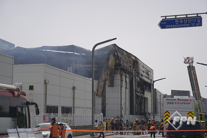 ![]() ▲ 소방관들이 경기도 화성시 서신면 전곡리에 위치한 아리셀 공장 화재를 진압하고 있다. ©FPN |