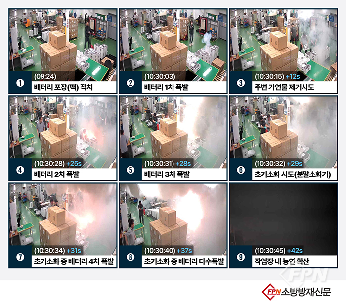국회 행정안전위원회 용혜인 의원실이 소방청으로부터 제출받은 화재 대응 보고 자료에 따르면 실제 화재 당일 오전 10시 30분 3초께 배터리의 1차 폭발이 발생한 뒤 3차 폭발까지는 불과 28초밖에 걸리지 않았다. 이후 작업자가 분말소화기를 사용해 초기 소화를 시도했지만 소용이 없었고 14초 후 검은 연기는 작업장 전체를 뒤덮었다. 1차 폭발 후 작업장 내 연기가 가득 차는 데 걸린 시간은 불과 42초 남짓이었던 셈이다.