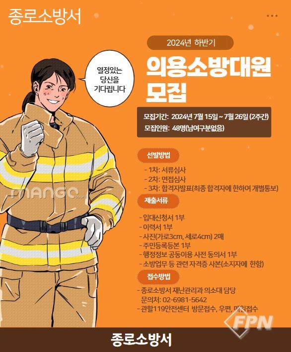 [FPN 정재우 기자] = 종로소방서(서장 김명호)는 오는 15일부터 26일까지 2주간 2024년 하반기 신규 의용소방대원을 공개 모집을 진행한다고 밝혔다.
