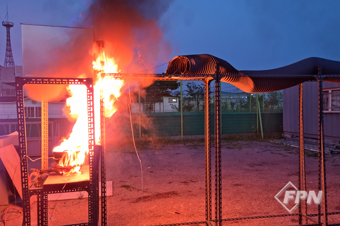 ![]() ▲ 2021년 7월 2일 진행된 가연성 타포린 덕트 실험. 식용유 기름에 착화한 불은 3분 만에 덕트로 확산했고 순식간에 연소 확대됐다. © 사진 출처 : 음식점 가연성 덕트 사용에 따른 화재위험성 연구(박석호 화재조사관) |