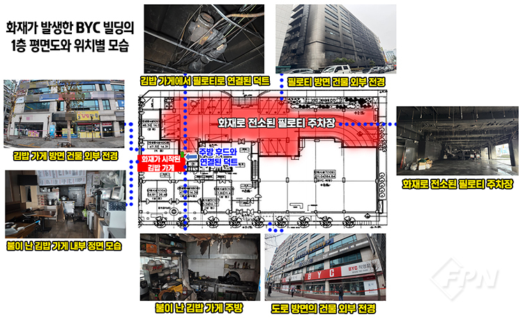 BYC 빌딩 김밥 가게와 연결된 덕트는 1층 필로티 주차장으로 빠지도록 구성돼 있었다. 이러한 필로티 벽체는 반드시 건축물의 다른 부분과 방화구획을 해야 한다. 필로티 주차장이나 건축물 내부에서 발생한 화재 시 화염이나 연기가 상호 유입되지 않도록 하기 위해서다.