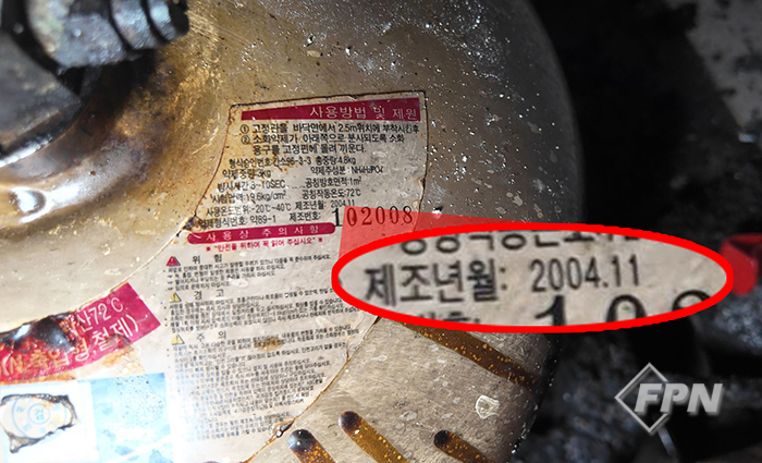 ![]() ▲ 김밥 가게 자동확산소화기의 제조년월은 2004년 11월로 생산된 지 20년이나 지났다. © FPN |