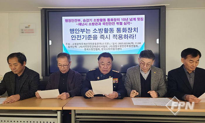 소방관처우개선국민운동본부(대표 최기용ㆍ배선장ㆍ이상근, 이하 소국본)는 지난 6일 “행정안전부(이하 행안부)는 법정 기준에 부합하는 소방구조용 승강기 비상통화장치 설치를 즉시 시행하라”는 내용의 성명을 발표했다.