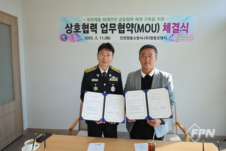 [FPN 정재우 기자] = 영종소방서(서장 정상기)는 11일 (주)영종오렌지(대표이사 김기열)와 취약계층의 화재안전에 대한 업무협약(MOU)을 체결했다고 밝혔다.