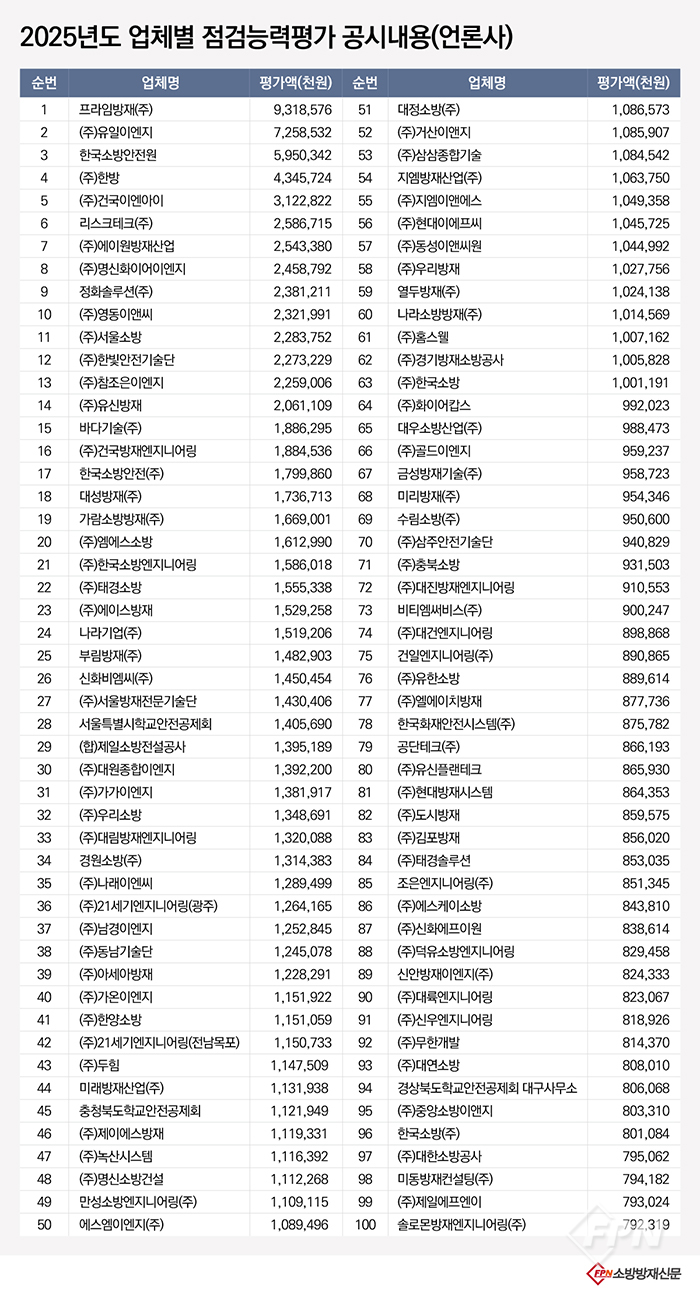 점검능력평가 결과 프라임방재가 93억1857만원으로 1위를 기록했다. 2위는 (주)유일이엔지(72억5853만원), 3위는 한국소방안전원(59억5034만원), 4위는 (주)한방(43억4572만원), 5위는 (주)건국이엔아이(31억2282만원)가 차지했다.