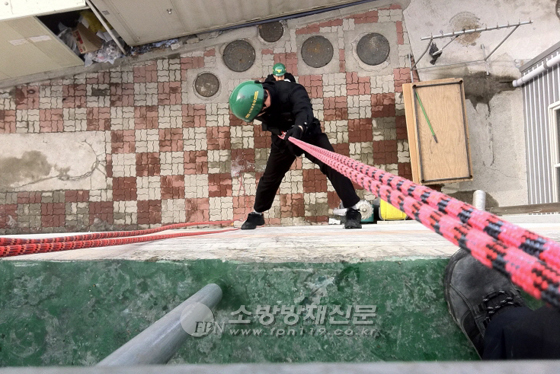 | ▲ 119구조대 고층건물 인명구조 훈련 © 금산소방서 제공 | | 금산소방서(서장 김현묵) 119구조․구급센터는 20일 아파트 등 고층건물의 인명구조 활동 시 신속한 현장 대응능력 향상과 효율적 소방 활동을 위해 고층건물 인명구조 훈련을 실시했다. 고층건축물은 구조적 특성상 화재 발생 시 내부 진입이 곤란하여 인명구조 및 화재 진압에 많은 어려움이 있다. 이에 금산소방서는 119구조대원 전원이 참석하여 소방서에 설치 된 로프하강 훈련장 등에서 119구조․구급센터장의 지휘 하에 로프하강 훈련 및 인명구조장비 조작훈련을 실시했다. 금산소방서 119구조․구급센터장은 “지속적인 훈련을 통해 고층건물 화재 발생 시 구조대원의 구조능력을 향상시켜 주민들의 생명과 재산을 보호하는데 최선을 다하겠다”고 말했다. 선근아 기자 sun@fpn119.co.kr