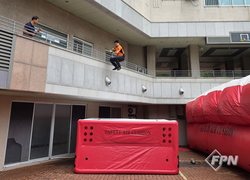 ▲ 종로소방서 구조대원이 아파트에서 지상에 설치된 공기안전매트로 뛰어 내리고 있다. © 종로소방서 제공