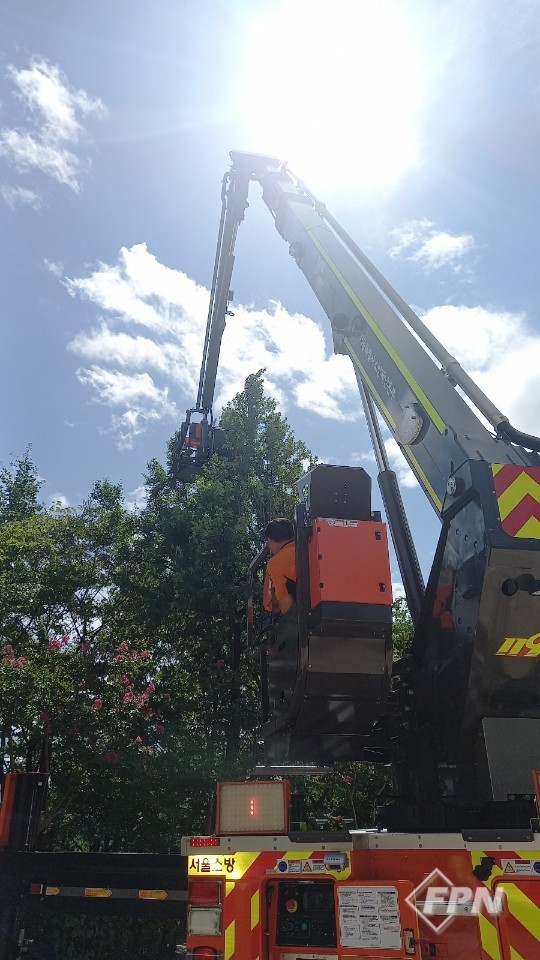 ▲ 종로소방서 굴절차량 운영요원이 굴절차량 다리를 펼쳐서 벌집이 있는곳으로 바스켓에 타고 있는 대원을 가까게 다가서고 있다