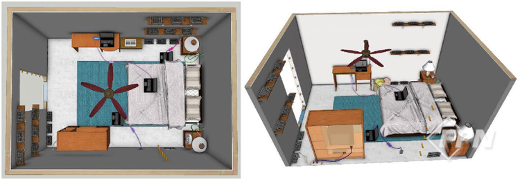 실험 장소인 연소실(Burn Room)은 약 3×4×2.4m 크기의 석고보드 구조물로 방문은 열려 있는 상태였다. 방은 실제 침실처럼 꾸며졌으며 여기엔 퀸사이즈 침대, 협탁 2개, TV 거실 장, 작동 중인 천장 실링팬, 책상, 노트북 4대가 포함된다.