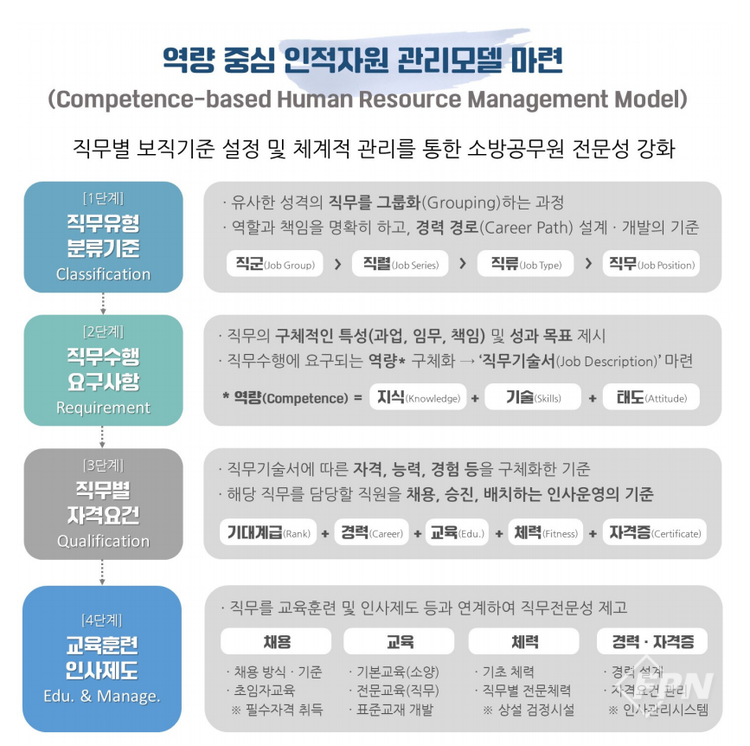 이를 위해 소방 직무를 35개로 분류하고 핵심 역량을 기반으로 교육내용을 개편했다. 이는 소방청과 소방미래비전위원회가 진행한 ‘소방공무원 역량 중심 인적자원 관리모델 마련을 위한 직무 분석’ 결과를 기초로 했다.