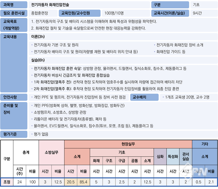 기존 커리큘럼 표준안은 마련된 지 4년이 지났기에 신종재난 이슈가 반영되지 않았다. 이번 개편에서는 전기차 화재 9, 산림화재 7, 신종재난대응 2시간 등 시간을 구체적으로 배정했다.