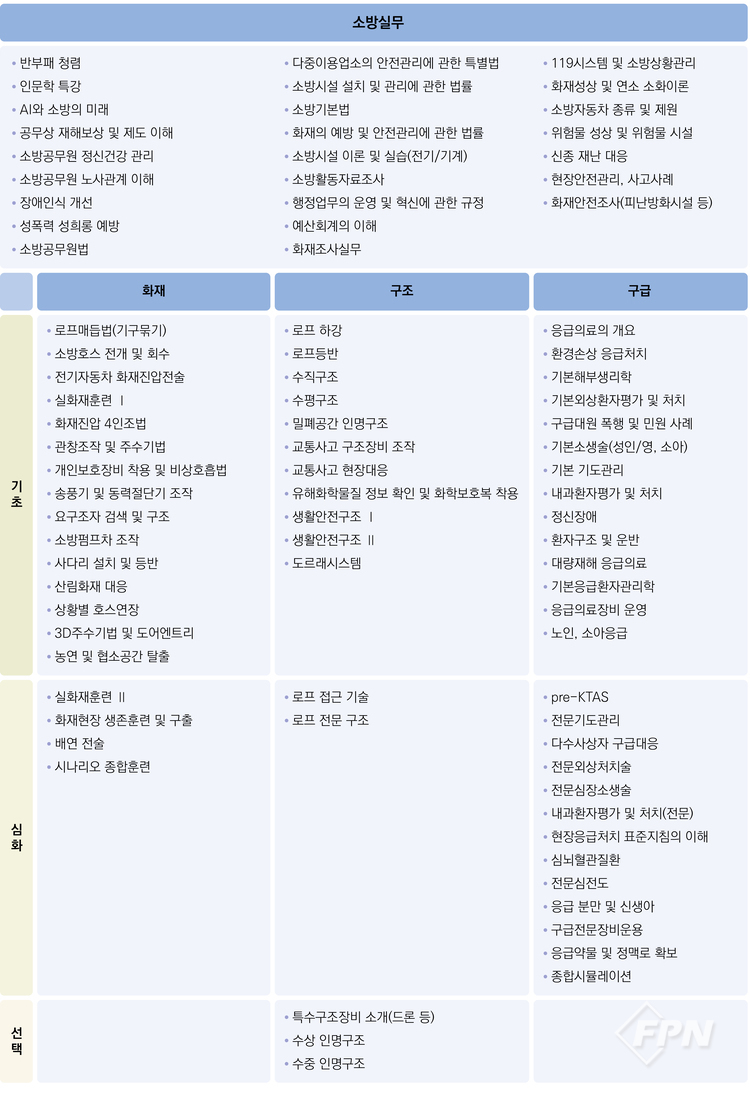 이번 개편을 통해 분야별로 필수 교과목을 지정하는 작업도 진행했다. 화재ㆍ구조ㆍ구급 분야는 기초와 심화로 나눠 세분화했다.