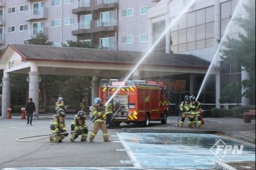 훈련은 ▲초기 화재대응 및 인명구조 ▲리조트 내 화재진압 ▲대피 유도 및 응급의료 지원 ▲산림화재 확산 저지 등 단계별 대응체계를 구축하는 과정으로 진행됐다.