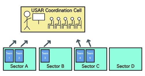 섹터 조정ㆍ섹터 조정셀(SCC) 1. 섹터화 소수의 팀이 임무에 대응하는 경우 UCC가 직접 조율한다. 그러나 팀의 수가 늘어나고 작전 지역이 확장되며 LEMA의 지시가 포함되면 임무의 복잡성이 커진다. 이때 UCC는 해당 지역을 지리적 섹터로 나눠 USAR 조정의 효율성을 높일 수 있다.