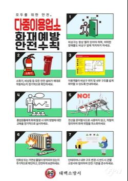 현재 소방서는 다중이용업소를 대상으로 ▲비상구 상시 개방 상태 유지 ▲통행로상 대피를 방해하는 장애물 제거 ▲소화기와 비상등 등 소방시설 정상 작동 여부 점검 ▲비상구 위치와 피난 동선이 설명된 안내도 비치 ▲문어발식 멀티탭 사용 지양 ▲난방기기 주변 인화성 물질 제거 등을 홍보 중이다.