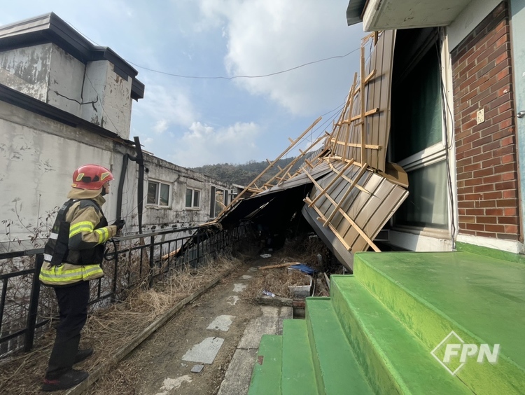 소방서에 따르면 이날 오전 10시 52분께 옥인동 소재 빌라에서 강풍으로 인해 지붕 강판이 탈락했다는 신고가 접수됐다.