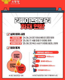 소방청 통계에 의하면 최근 5년(2020~2024년)간 발생한 리튬이온 배터리 관련 화재는 678건이다. 특히 2020년 98건에서 2024년 117건으로 증가했다. 기기별로는 전동킥보드(485건)가 가장 많았고 전기자전거(111건), 휴대폰(41건), 전기오토바이(31건), 전자담배(10건) 순으로 집계됐다.