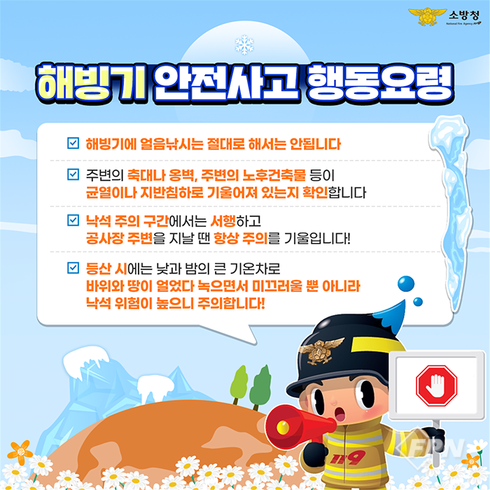 이에 소방청은 ▲주변의 축대나 옹벽, 노후 건축물 등이 기울어지거나 금이 간 곳은 없는지 꼼꼼히 살피기 ▲산행 시 낙석 발생 위험이 큰 절벽 아래나 바위 근처로의 이동은 자제 ▲지정된 등산로 이용하고 미끄럼 방지 등산화 착용 ▲포트홀(도로 파임) 발견 시 서행 운전 ▲낚시 등 수난 활동 시엔 얼음 위 진입 삼가기 등 해빙기 안전사고 예방을 위한 주요 행동 요령을 안내했다.