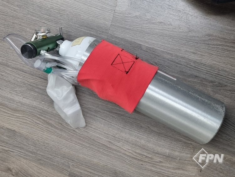 ![]() ▲ 산소통은 ‘Zap Strap’이라는 붉은 끈으로 비 재호흡 마스크와 비강 케뉼라를 묶어 놓은 후 준비한다.
