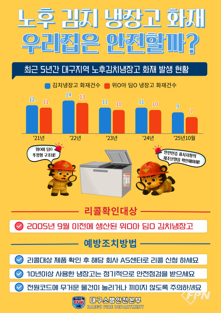 [FPN 정재우 기자] = 대구동부소방서(서장 심춘섭)는 노후 김치냉장고로 인한 전기화재 예방에 대해 집중 홍보한다고 지난달 28일 밝혔다.