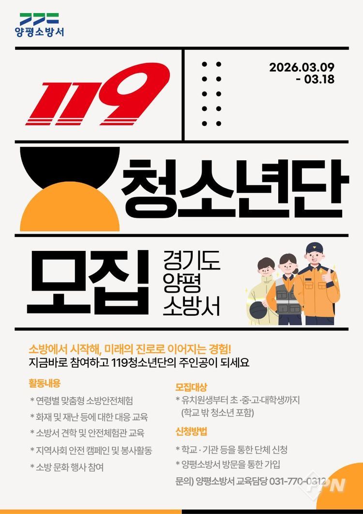 [FPN 정재우 기자] = 양평소방서(서장 이준희)는 ‘2026년 한국119청소년단’ 신규 단원을 모집한다고 12일 밝혔다.