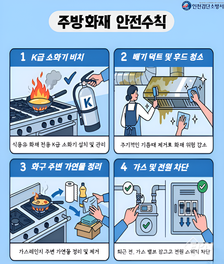 오원신 서장은 “주방은 단 한 번의 부주의가 대형 화재로 이어질 수 있는 공간”이라며 “화재 예방을 위한 기본 안전수칙을 철저히 지켜주시고 주방자동소화장치를 점검해 주시길 바란다”고 전했다.