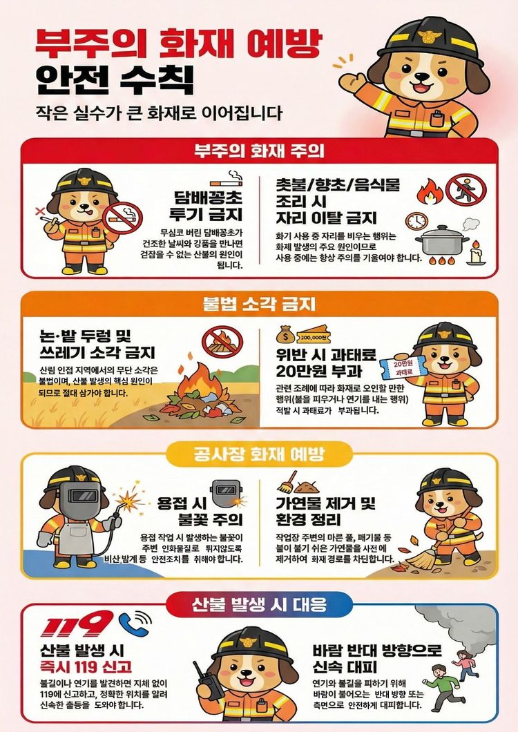 봄철은 담배꽁초 투기, 촛불ㆍ향초 사용, 음식물 조리 중 자리 이탈 등 일상 속 부주의로 인한 화재 발생 위험이 높아지는 시기다. 특히 건조한 날씨와 강풍이 겹칠 경우 화재 확산 속도가 빨라 사전 예방이 무엇보다 중요하다.