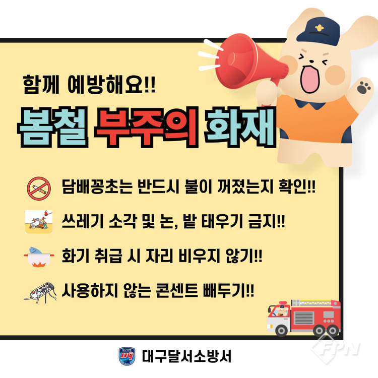 [FPN 정재우 기자] = 달서소방서(서장 김형국)는 지난 5일 월광수변공원에서 협력단체와 함께 산불ㆍ부주의 화재 예방을 위한 캠페인을 전개했다고 밝혔다.
