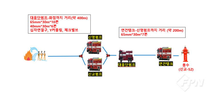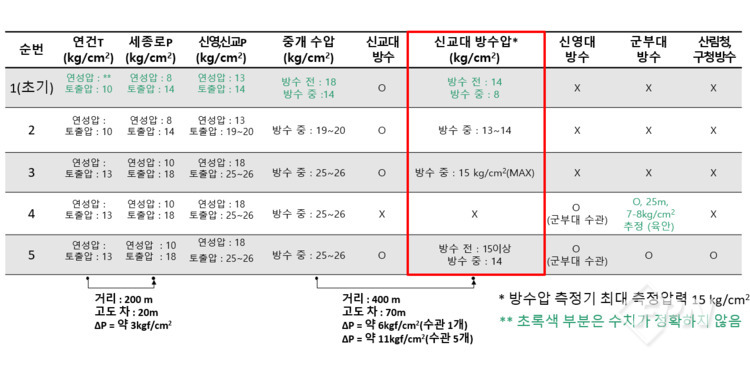특히 인왕산 7부능선 모자바위 해발 200m에서 약 600m에 달하는 고압호스 연장과 직ㆍ병렬 중계송수 방식을 활용해 화점까지 소방용수를 안정적으로 공급하는 데 중점을 뒀다. 이 과정에서 말단 송출 압력이 5회에 걸쳐 평균 13~15kgf/cm²에 달하는 것으로 측정했다.