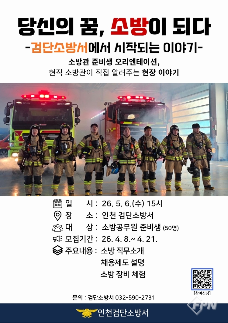 [FPN 정재우 기자] = 인천 검단소방서(서장 오원신)는 미래의 소방관을 꿈꾸는 수험생들을 위해 오는 5월 6일 ‘당신의 꿈, 소방이 되다 검단소방서에서 시작되는 이야기’ 오리엔테이션을 개최한다고 16일 밝혔다.